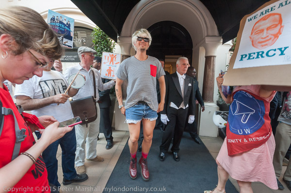 Adam Clifford from Class War dances on Sotheby's carpet which is on the pavement