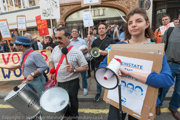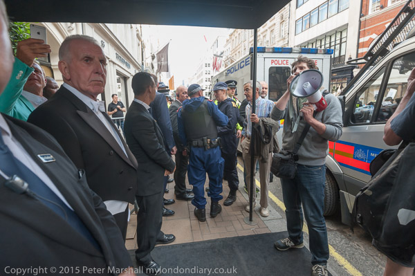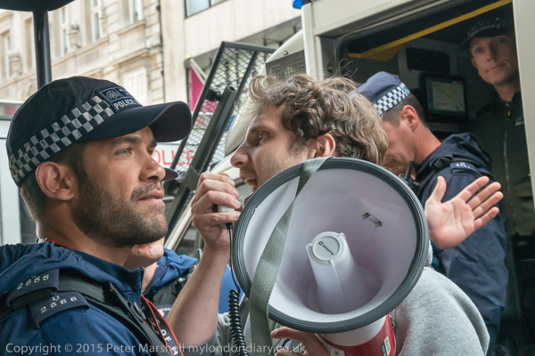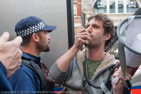 Sandy Nicoll from SOAS Unison smiles at police who ask him to move. But two vans of reinforcements had arrived