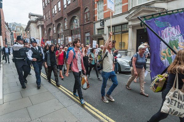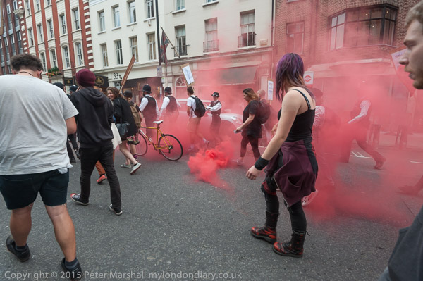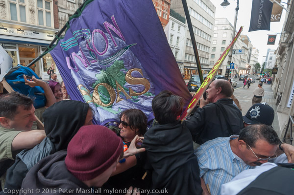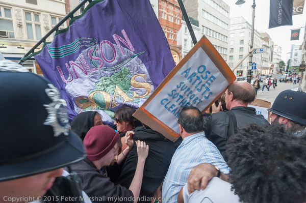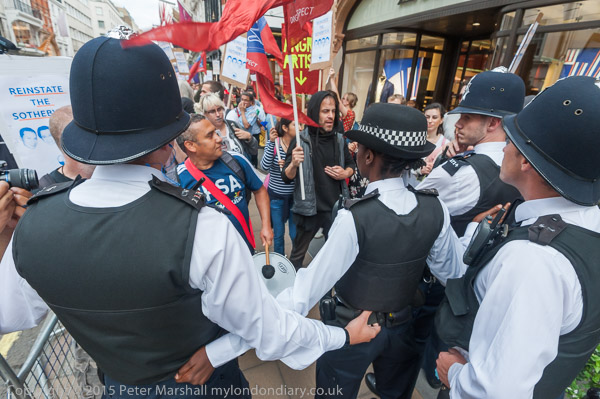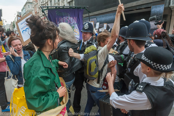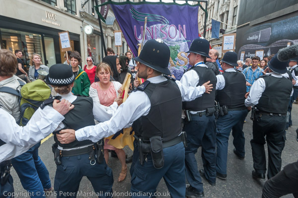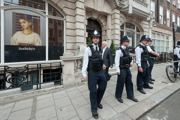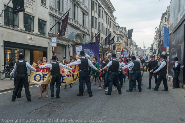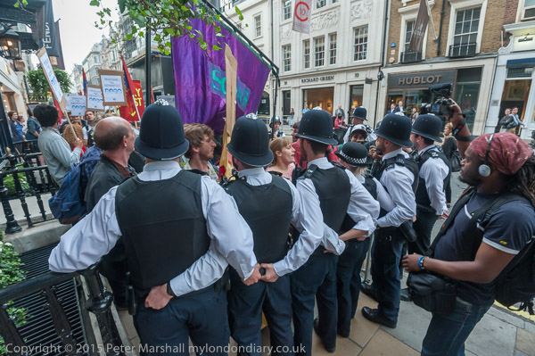 Police again stop the marchers as they approach Sotheby's closed front entrance on New Bond St