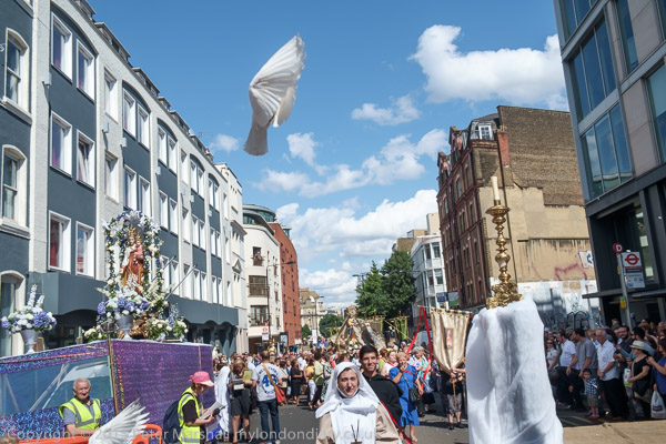 Three more doves as the float carrying the statue of Our Lady of Mount Carmel on a float joins the procession