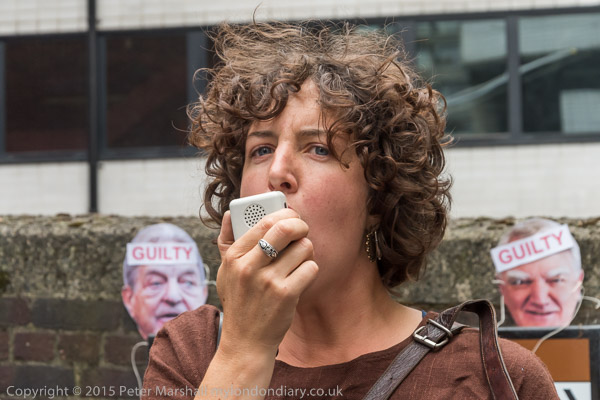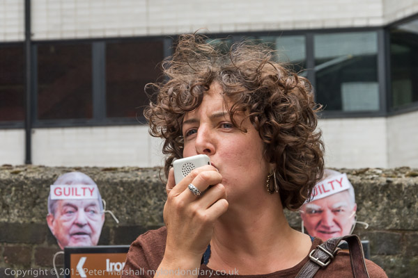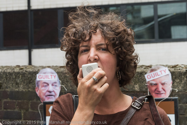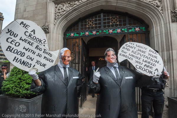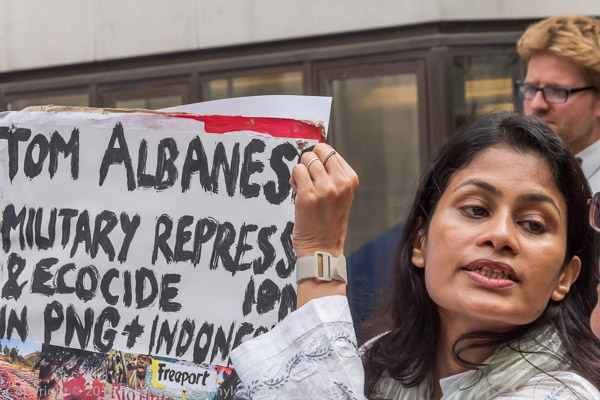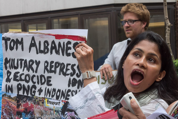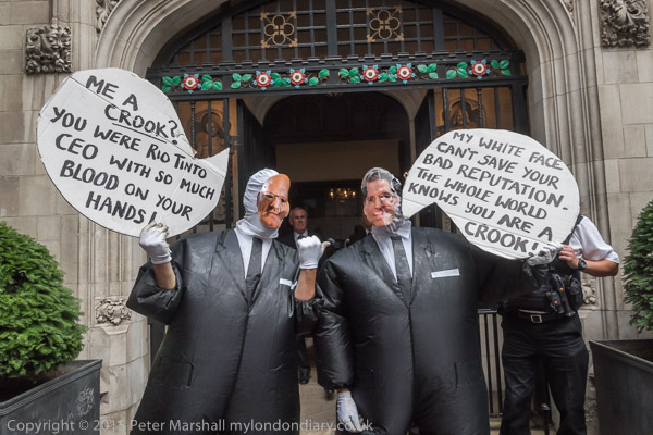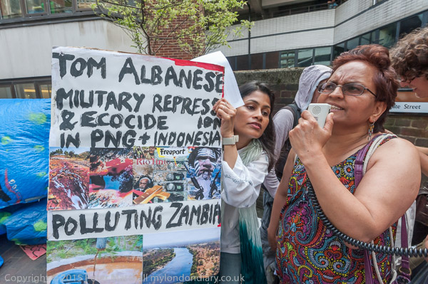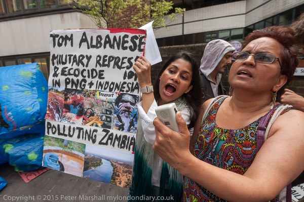 ![]() the Anargil chub figure holds a speech bubble about the Vedanta CEO 'I saved you from the scrap head to rescue Vedanta and you have failed!!' ![]() A woman holds up a Free West Papua flag and a poster against Vedanta ![]() The Vedanta monster in front of the Ironmongers' Hall with the men in chub suits ![]() with masks for Anil Agarwal and Vedanta CEO Tom Albanese ![]() ![]() 'Copper Looted River Polluted - Zambia, India, Australia' and other posters ![]() 'Tom Albanese - Military Repression & Ecocide in PNG (Papua New Guinea) & Indonesia, Polluting Zambia' ![]() ![]() ![]() |