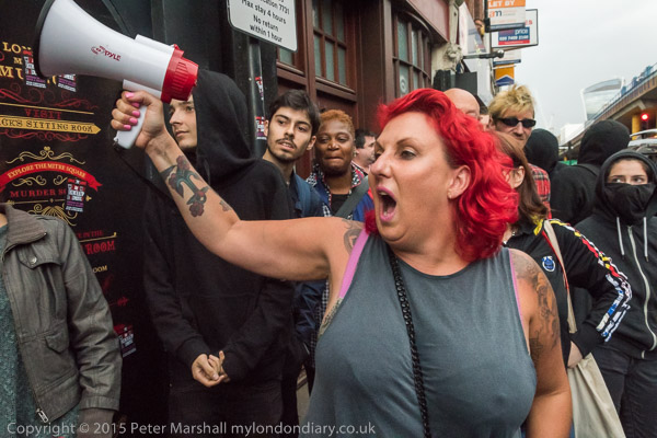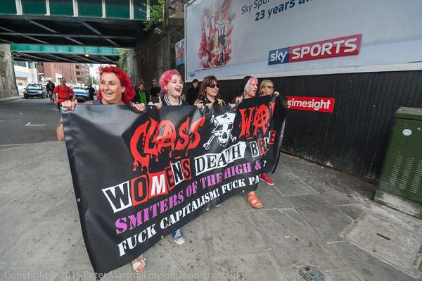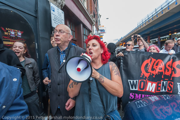 Class War make their opinion of the shop featuring lurid displays of extreme violence against women clear