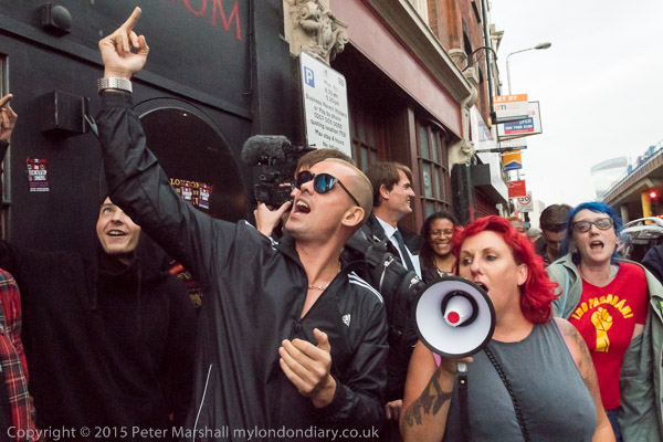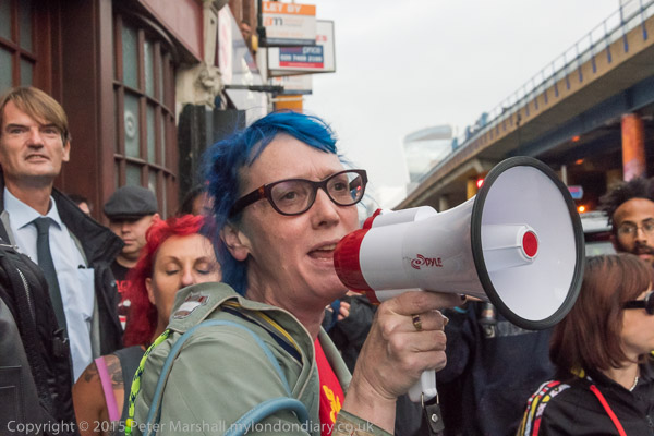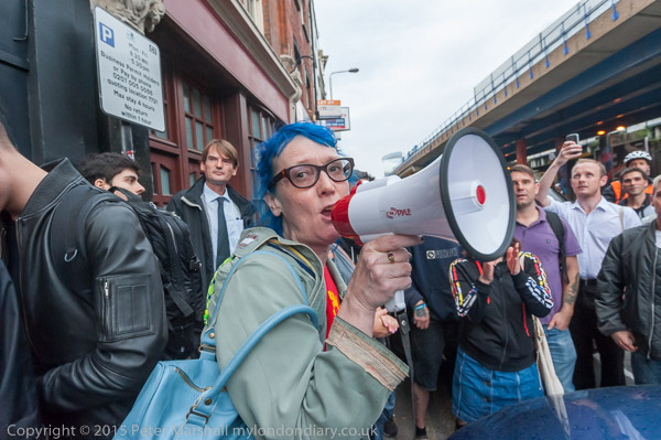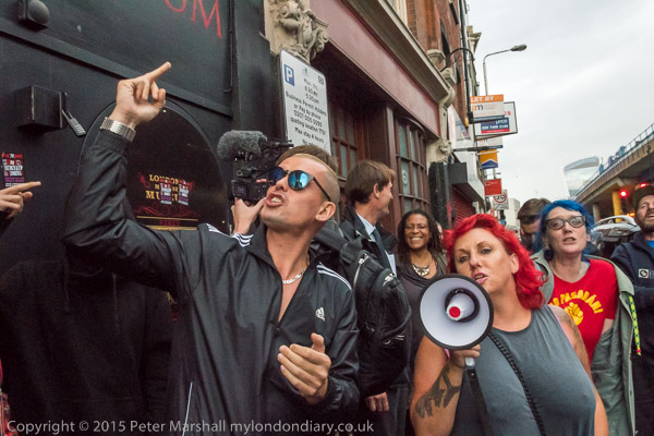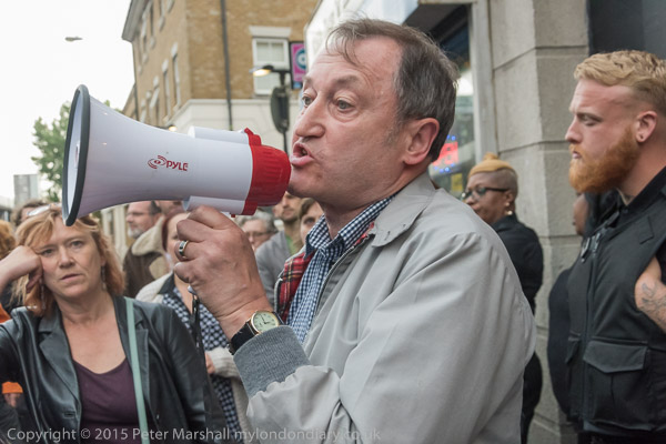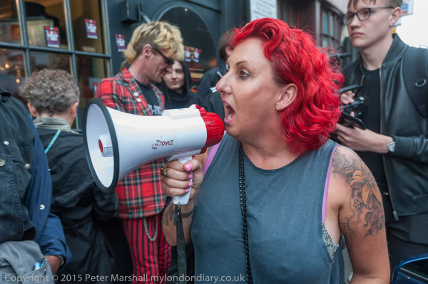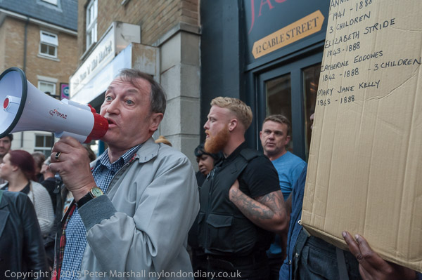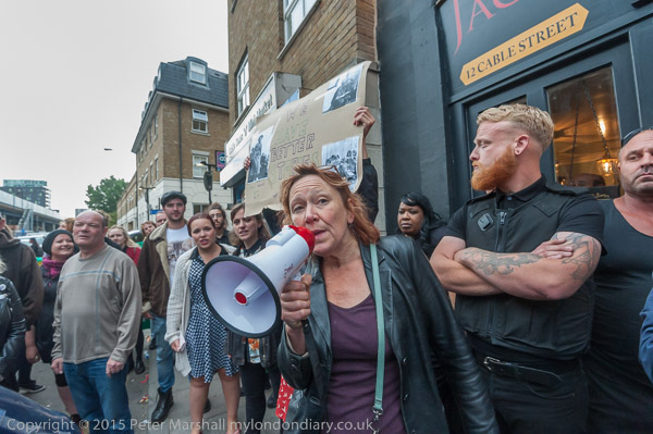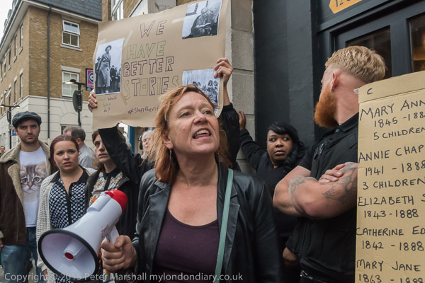 A speaker from Action East End talks about the heritage of the area and how this shop offends it