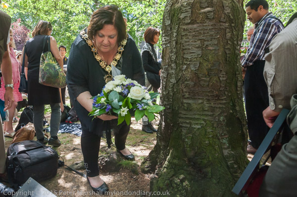 Cllr Larraine Revah, Mayor of Camden lays flowers at the Hiroshima cherry tree