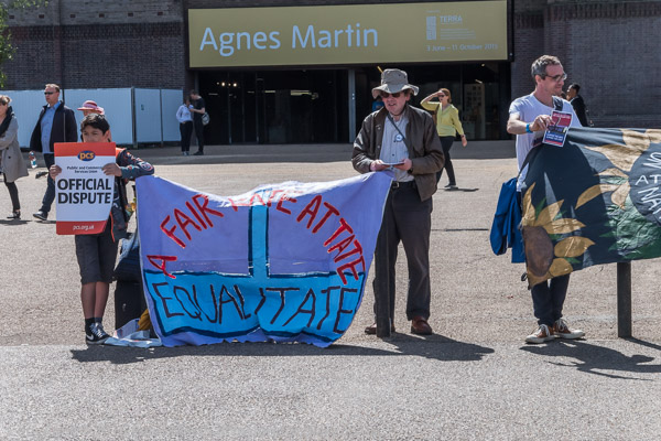 Protesters hold the Equalitate and National Gallery no privatisation banners on the riverside walk