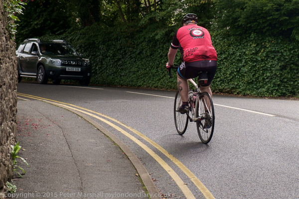 'Fat Lad at the Back' of a group of cyclists going up the hill out of Arnside