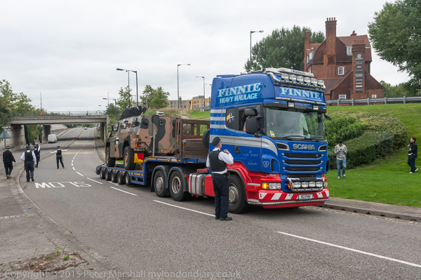 A lorry with a military vehicle on it, perhaps a rocket launcher - approaches