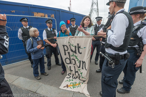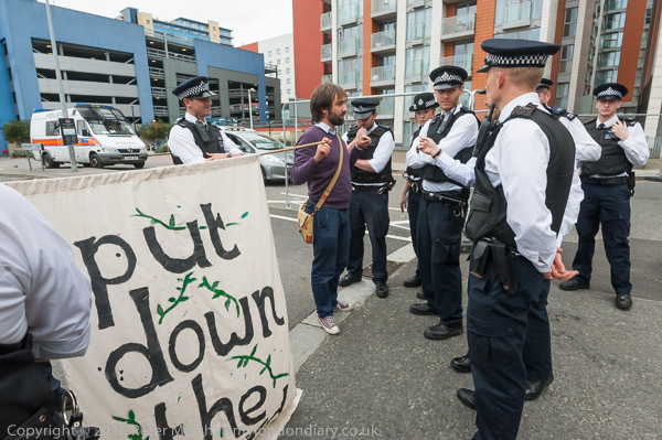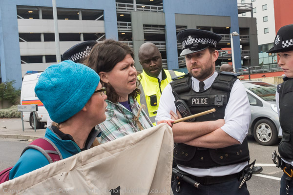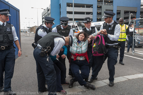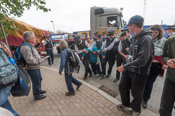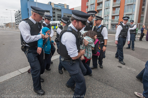 Eventually the police drag away to two protesters who have refused to move