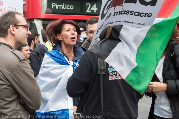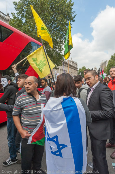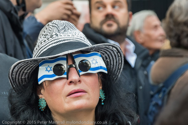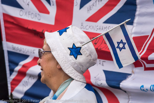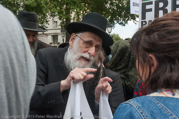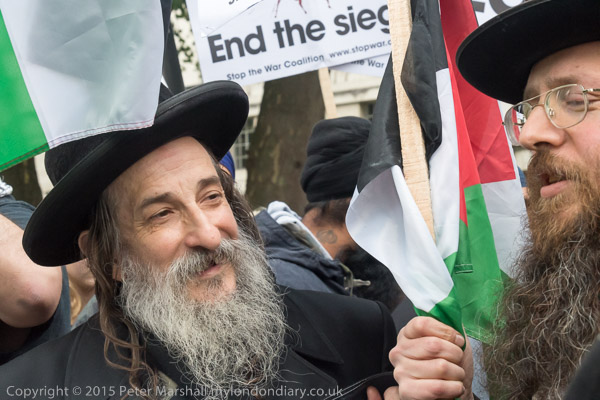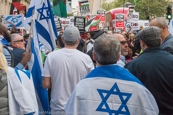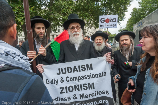 ![]() Neturei Karta support Palestine and are opposed to Israel as a state ![]() 'Judaism - G-dly & Compassionate; Zionism - G-dless & Merciless' ![]() Star of David and hearts on a banner ![]() and a woman with a hat with Star of David symbols and an Israeli flag ![]() An argument in the middle of the road gets a little heated ![]() ![]() and a man in a keffiyeh at the centre of the crowd by Downing St clims up a lamp post with a Palestinian flag ![]() ![]() A woman has Israeli flag sunglasses ![]() |
