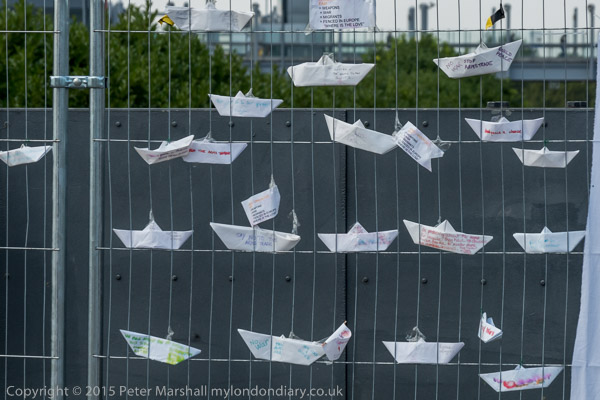 Paper boats on the fencing around Excel with messages about the war refugees who are drowning on their way to Europe