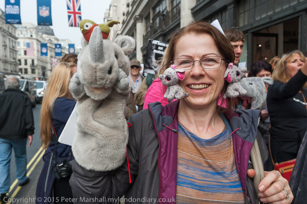 As well as two elephants on her glasses she also had a rhino glove puppet