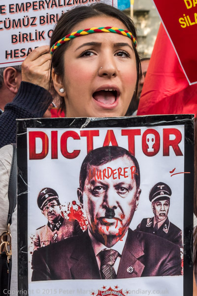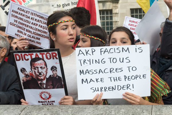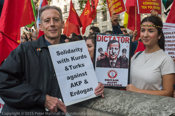 Peter Tatchell holds a poster 'Solidarity with Kurds & Turks against AMP & Erdogan'