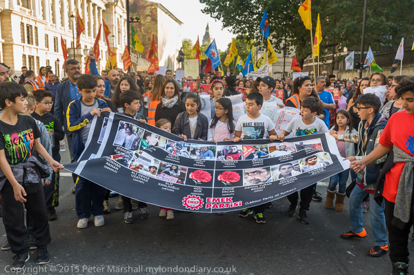 People march up Whitehall behind a Day-mer Banner hodling pictures of some of those killed in Ankara massacare