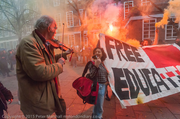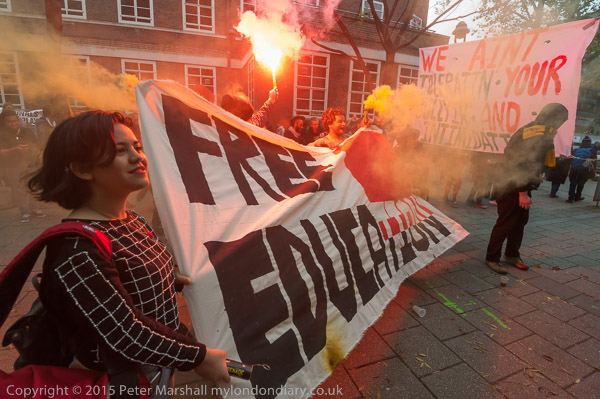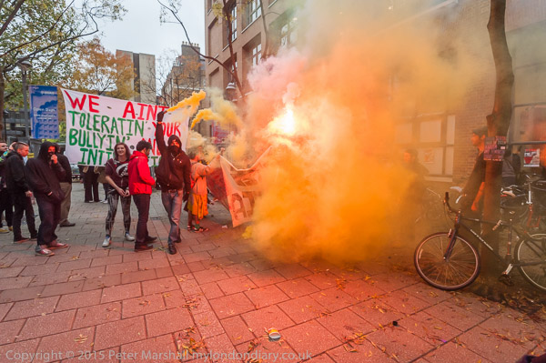 Outside the occupation flares are lit
