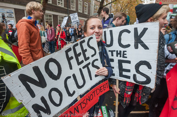 There were a number of speeches in Malet St, where the march formed up including those by Shadow Chancellor John McDonald and Antonia Bright of Movement for Justice. As well as the issues of student fees and loans, the march also called for an end to borders and the scapegoating of immigrants.