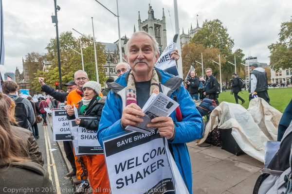 Campaigners from the Save Shaker Aamer Campaign who mounted a weekly vigil for his release opposite Parliament every Wednesday when Parliament was sitting today held a celebration in Parliament Square to welcome him home.