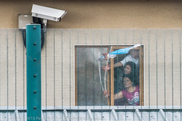 Movement for Justice protesters waved and shouted at the women inside the prison, calling for an end to racist immigration detention. The prisoners came to the windows and joined in the protest. Ladders were used to put a large banner on the fence.