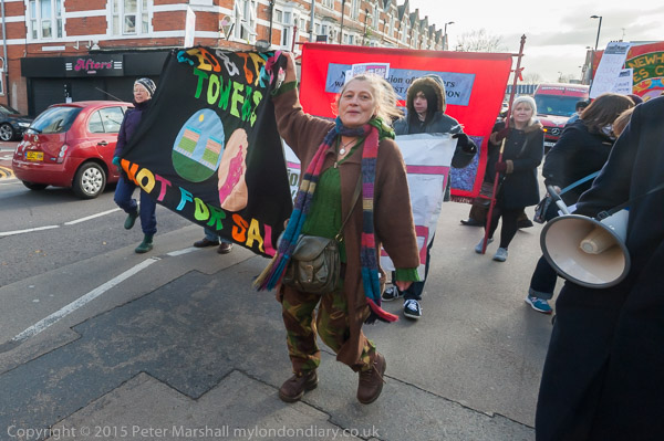 Most of this took place while I was on my way to the front of the march, photographing some of the marchers, including anti-fracking groups from Lancashire - the 'Nanas from Nanashire' including the redoubtable Tina-Louise Rothery - and the people carrying the main banner 'The People's March for Climate & Jobs', accompanied by giraffe and other animal costumed marchers as well as representatives of other groups, which had stopped to put a gap between it and the Global Frontlines.
