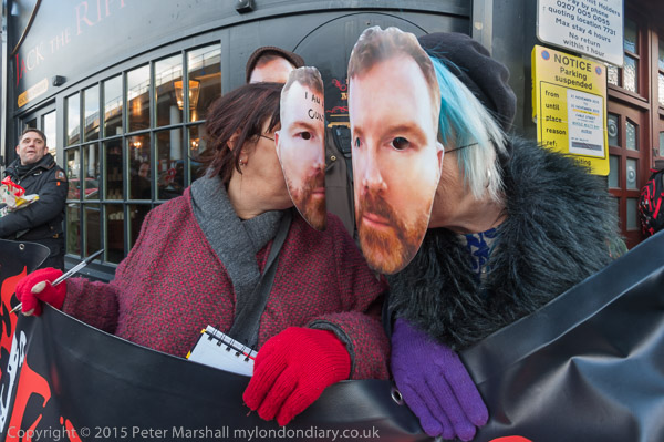When I arrived well before the protest was due to start, a hundred or so people, some with placards, were milling around in front of the gates to Downing St, with police trying to clear them away so that barriers could be put down on that side of the street. Eventually more police came and persuaded them all to move across to the other side of the road where a large crowd was already standing with placards and banners.