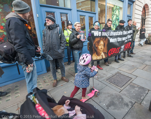 The police seemed very reluctant to take action, failing to arrest the employee. Possibly their reluctance was because unless they were neglecting their duty of keeping an eye on the protest they cannot have failed to see the assault. Later as I walked away from the church past their van they were discussing the case over the radio and seemed to be rather worried about it.