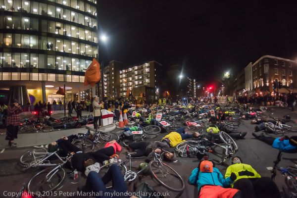 Cycling campaigner Alex Raha read a funeral poem for cyclists and eight year old Scarlett Brady Hughes read out the names of the 21 cyclists killed before cyclists walked out onto the roads with their bikes for the silent die-in. Police stood back as stewards stopped the traffic for this. Once the traffic was stopped they went to explain to those in the queues what was happening and why, and although a number of motorists made U-turns and drove away, I heard none of the angry blowing of horns that usually accompanies any traffic stoppage in London.