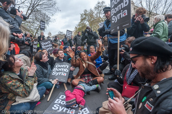 People sat down and chanted 'Don't Bomb Syria' and other slogans and sat blocking the highway until well after the rally had finished. After around an hour the police, who had been going around for some time asking people to move with little success stepped up their action. More police had arrived and the began to tell people that they would face arrest unless they moved. Slowly and reluctantly people began to get up, and eventually everyone was back on the pavement.