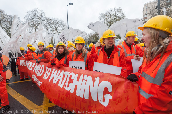 Park Lane was beginning to fill up with people as I arrived early for the March for Climate action, one of about 2,500 events around the world on the weekend before the start of the COP21 talks in Paris, where 147 heads of state and government are to meet and try to agree on limiting carbon emissions in the hope of limiting global warming.