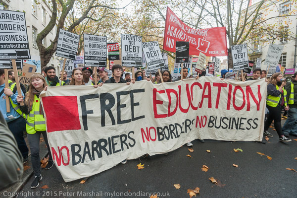 The main banner 'Free Education - No Barriers, No Borders, No Business'