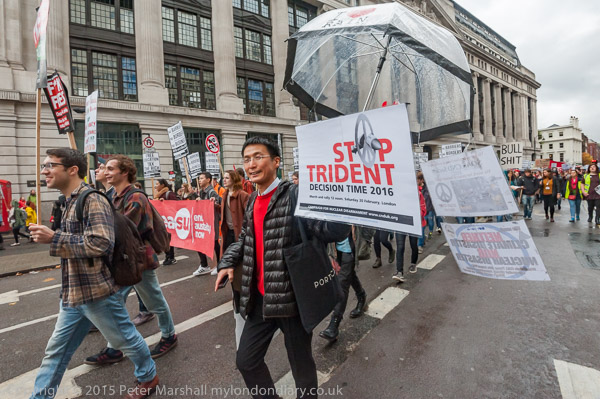 An anti-nuclear campaigner with 'Stop Trident' posters hanging from his umbrella