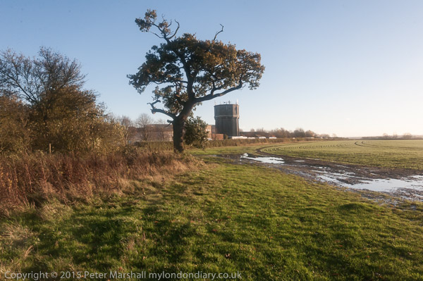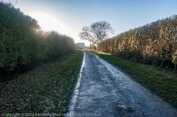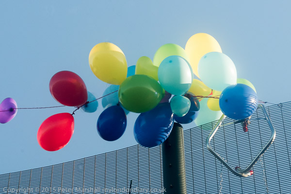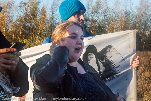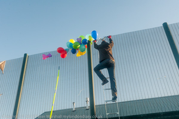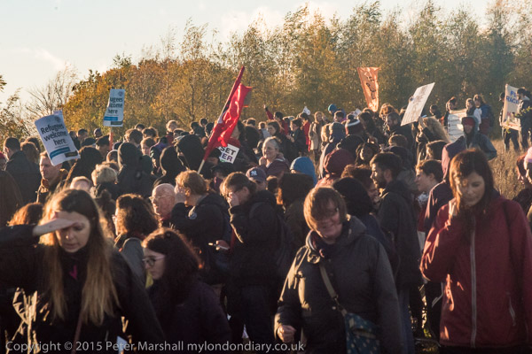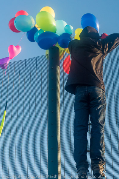![]() People bring balloons to the fence ![]() and take them to the top of the fence ![]() ![]() ![]() ![]() The crowd stands on the hill in late winter afternoon sun ![]() as I leave while the protest is still continuing ![]() and make my way along the footpath - here the end of a byway ![]() back to the road. On the other side is a very large field and though it's sunny, a cold wind blows across it. |