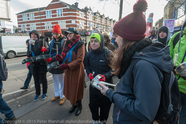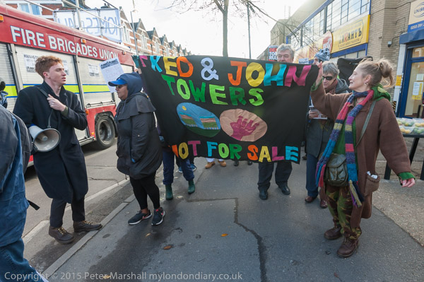 ![]() Press TV interviewed one of the campaigners who holds a placard 'I have moved 4 times in 3 years! I want secure affordable housing' Although Press TV covered the event there was (as usual) no interest shown by mainstream UK media ![]() Marchers stream out of the park ![]() ![]() ![]() and across the High Road to form up for the march ![]() Unite Housing Workers ![]() A samba band accompanied the marchers ![]() ![]() ![]() 'Fred & John Towers Not For Sale' |