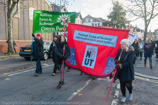 ![]() ![]() Waltham Forest Trades Council ![]() Marchers with Socialist Party placards ![]() ![]() Waltyham Forest Saving our NHS ![]() ![]() The Socialist Party banner is rather transparent ![]() ![]() ![]() Waltham Forest & Redbridge Green Party and Altham Forest NUT banners on the march |