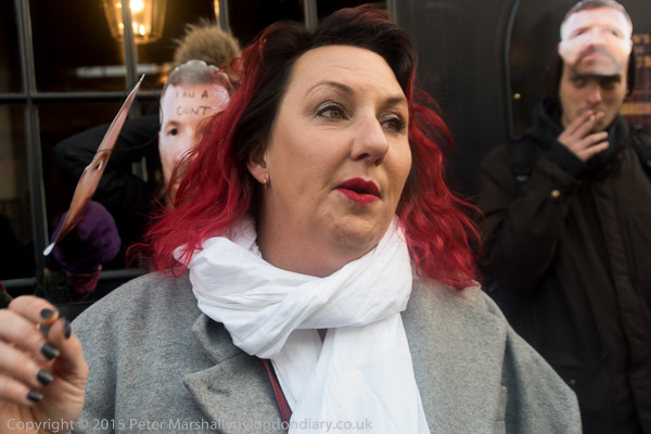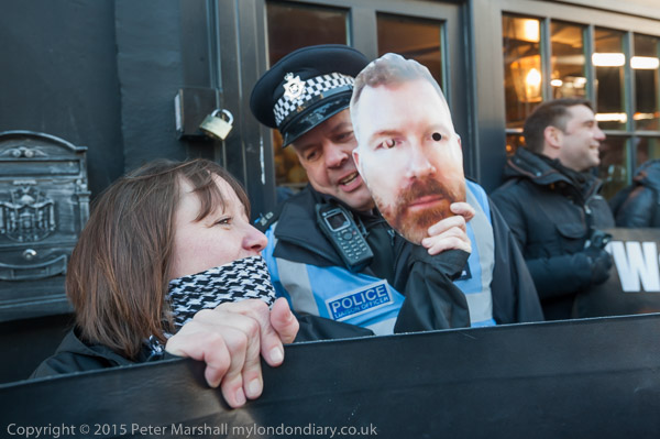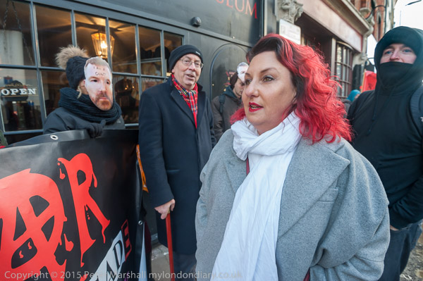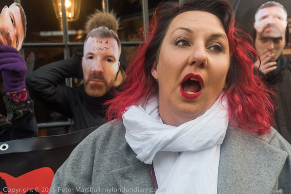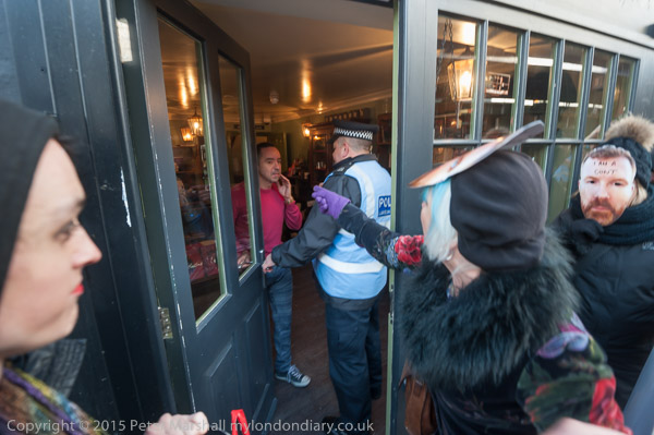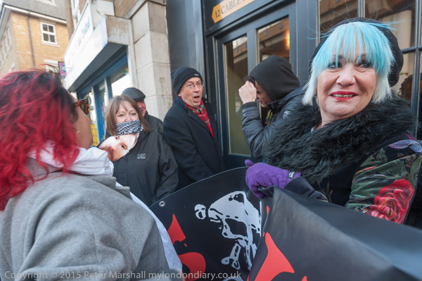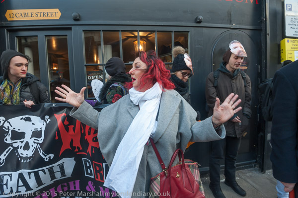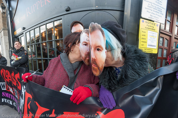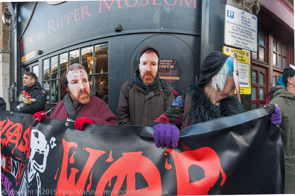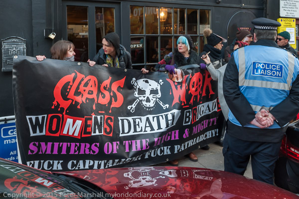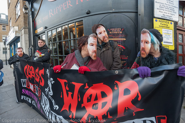 Class War arrive at the Ripper 'museum' with the Womens Death Brigade banner and wearing masks showing