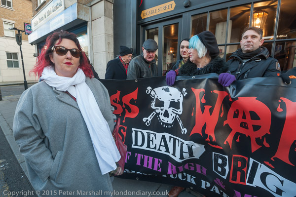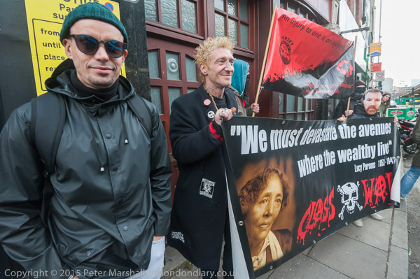 Adam and others from Class War with the Lucy Parsons banner against the wealthy