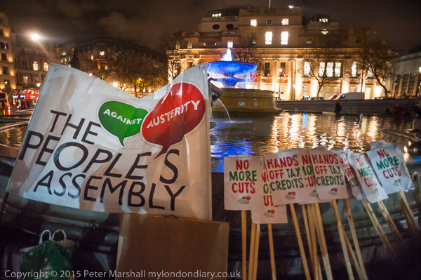 Osborne heads lined up next to the fountain with the message 'No More Cuts'