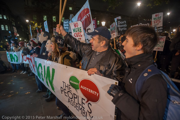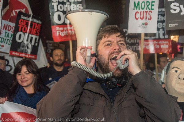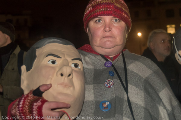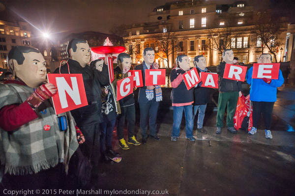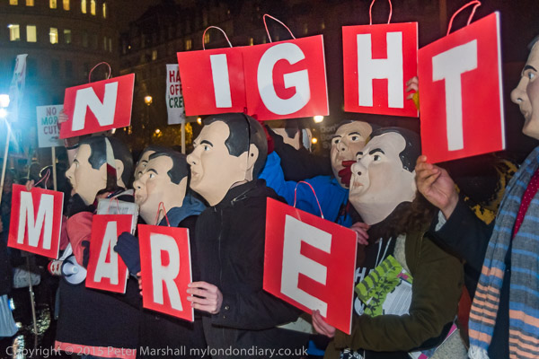 Campiagners wearing Osborne heads hold up letters to spell out NIGHTMARE
