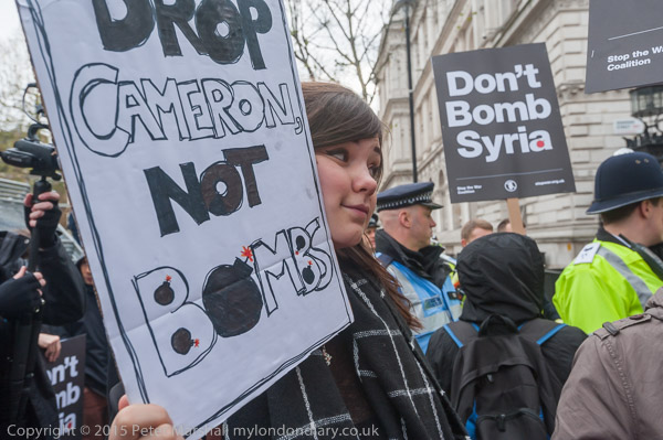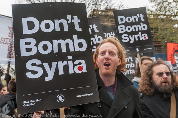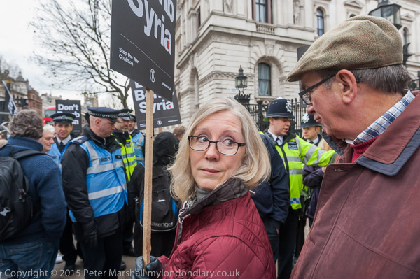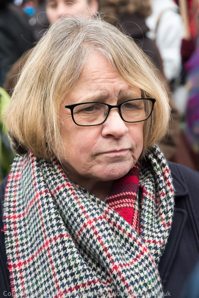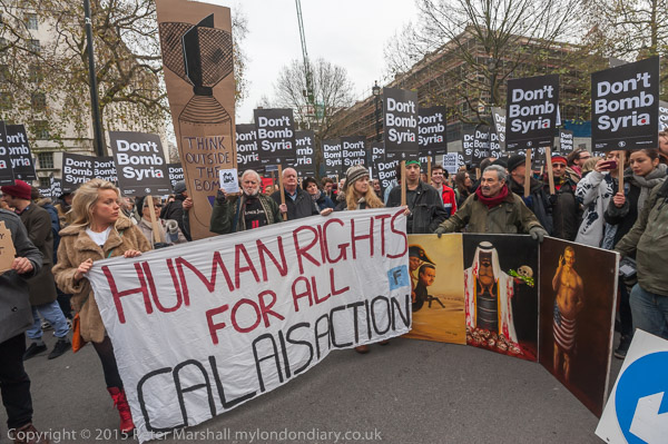 The protesters spilled out into the road towards barriers down the centre. A banner 'Human Rights for All - Calais Action'