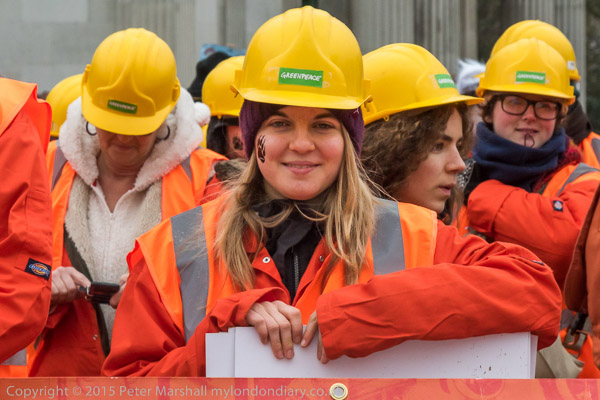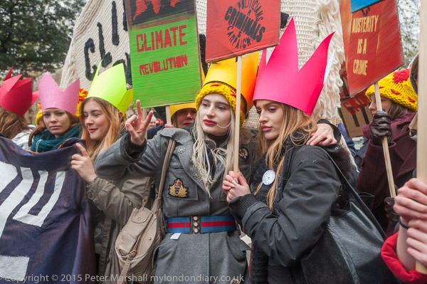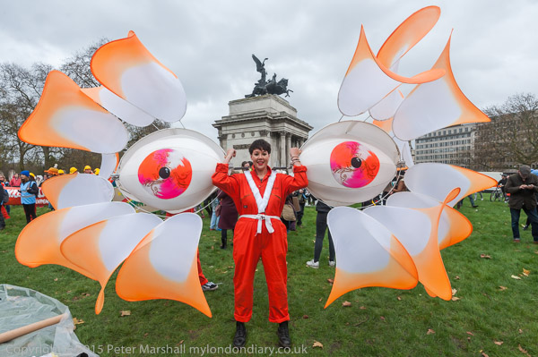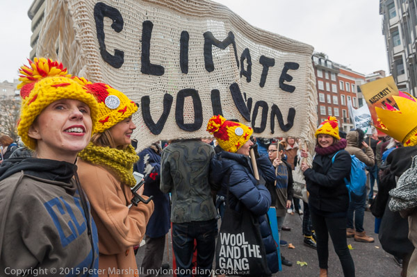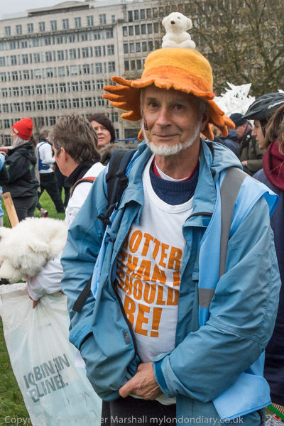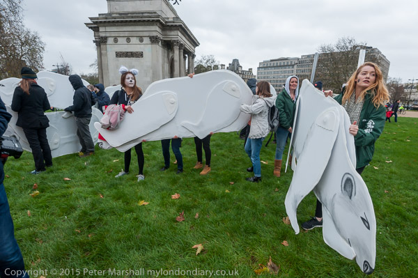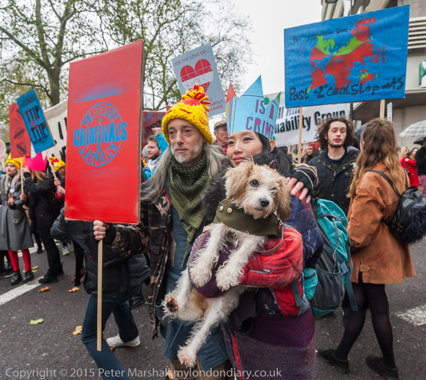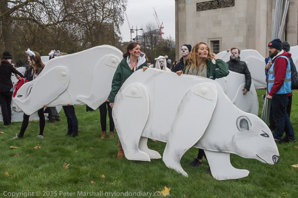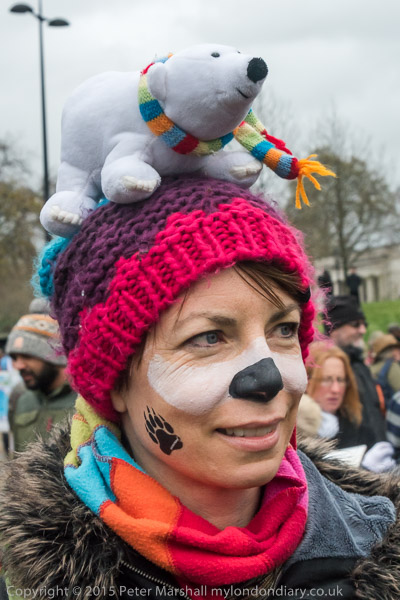 Another polar bear on a protester's head. And a woman marching for two French protesters whose Paris climate march was banned