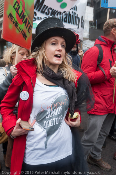 A Junior Doctor shows off the t-shirt that Vivienne Westwood designed for their protest