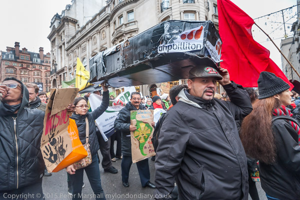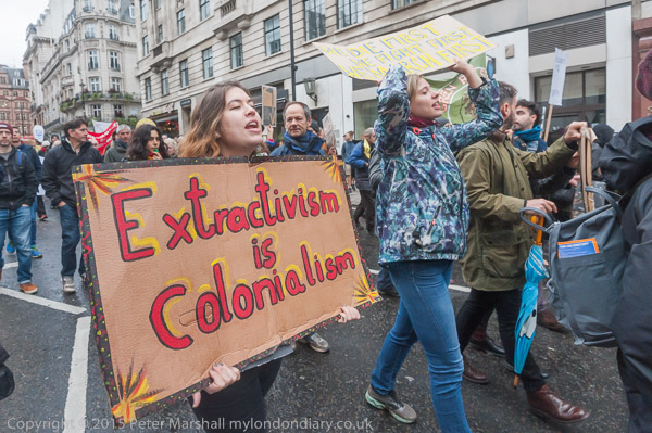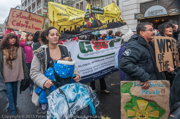 The front of the People's Climate March in Piccadilly with the Global Frontlines banner