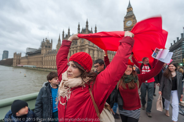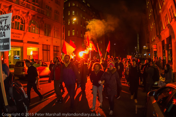After the rally the protesters then marched to the Conservative and Labour Offices to deliver letters. They stopped first at the Tory HQ where a small delegation went into the yard through the police guard to deliver a letter, then marched on towards the Labour Party HQ. On the way a red smoke flare lit up the street for a minute or so in the middle of the march.