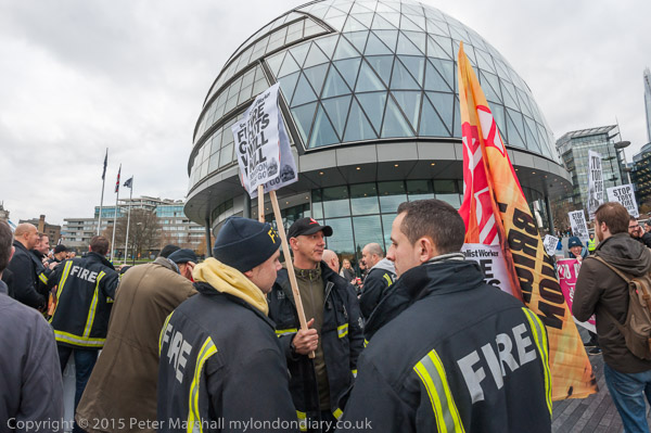 Firefighters and supporters protested at City Hall against plans to get rid of 13 fire engines and slash 184 firefighters in the London Fire Brigade. Cuts and fire station closures have already increased response times, resulting in people who might otherwise have been rescued dying in fires or jumping to their death in attempts to escape.