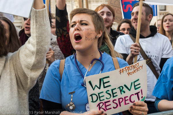 Healthcare students who work 50% of the time on placements during their courses are appalled by George Osborne's scrapping of NHS student bursaries from 2017. They protested saying it will land them with huge debts and deter recruitment to courses.