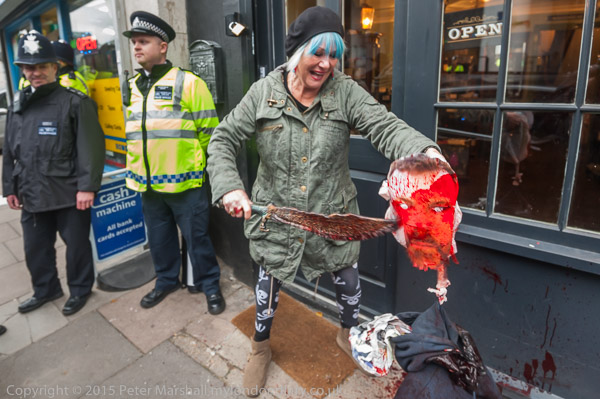 Class War brought with them a 'guy' dressed in jacket and jeans, with a mask of 'museum' owner and Ripper promoter Mark Palmer-Edgecumbe. Class War's Jane Nicholl had borrowed a plastic scimitar or cutlass from her grandson, and used it to attack the dummy in front of the shop with considerable vigour, bursting several small bags of fake blood that were attached to it.