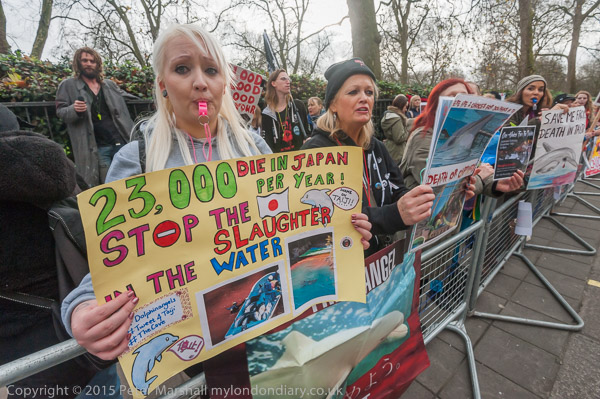 A protest outside the Embassy called for an end the the annual slaughter of over 20,000 dolphins, porpoises and small whales in Taiji Cove in Japan, where their blood turns the sea red.