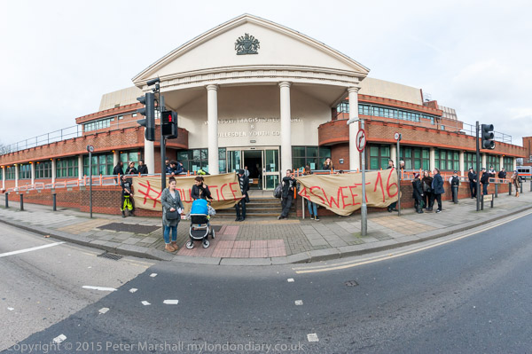 Protesters outside Willesden Magistrate's Court supported the protesters arrested for obstructing High Court bailiffs during the eviction of Sweets Way estate in September. I left before the verdict was given and today's #Justice4Sweet16 defendants were given a conditional discharge.