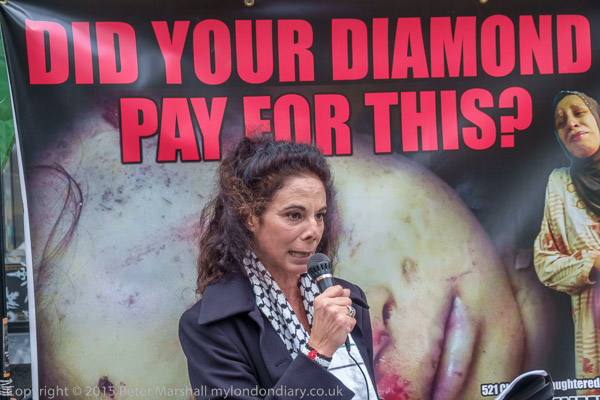 Protesters stood with banners and Palestinian flags outside the Tiffany shop in Old Bond St, attracting considerable attention as they informed customers entering and leaving the shop about the provenance of the diamonds that were on sale inside. 'Blood on your hands' shouted one of them, and a lengthy speech explained the role of Steinmetz, whose Foundation 'adopted' the Israel Army's Givati brigade, "fostering close relationships with the commanders and their soldiers", and "buying equipment " for them during Operation Cast Lead, the attack on Gaza.