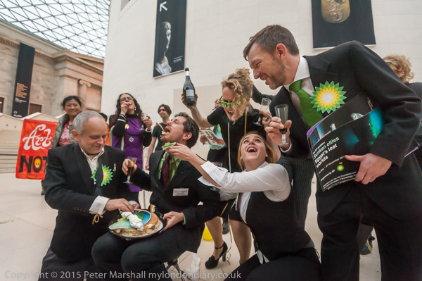 In a protest against sponsorship of arts institution by one of the leading global polluters BP to give itself an false positive image, 'actor-vists' from 'BP or Not BP?' staged a performance of a play depicting 'BP executives' giving a farewell party to departing Museum director 'Neil MacGregor' inside the British Museum’s Great Court as visitors and security stood and watched.