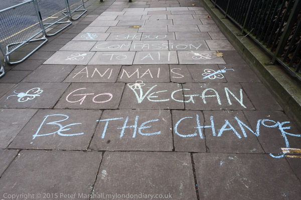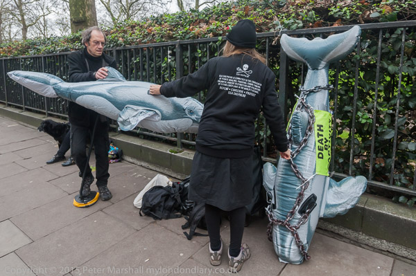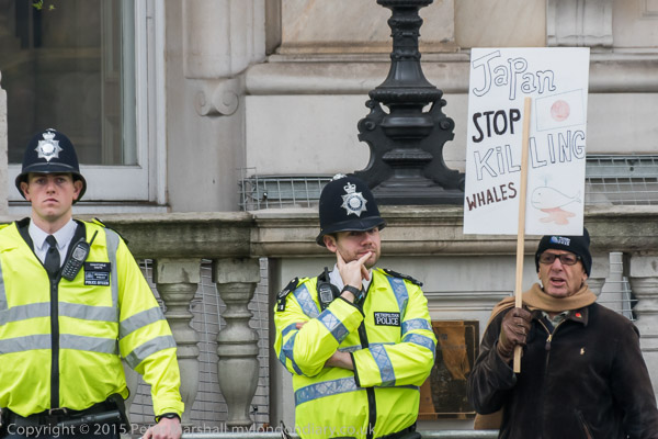 On the other side of the road were police officers in front of the embassy and a protester against whaling who was several hours early