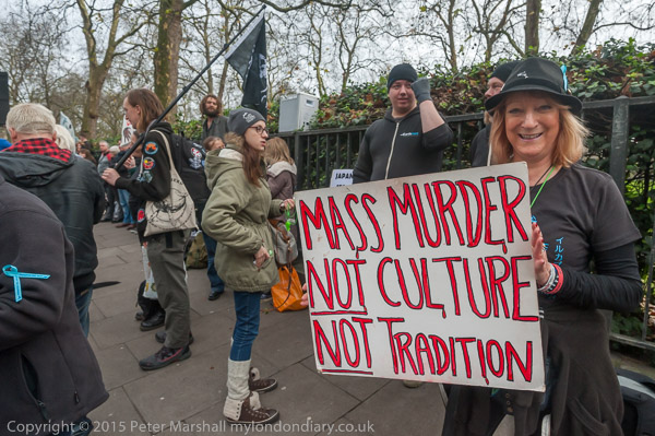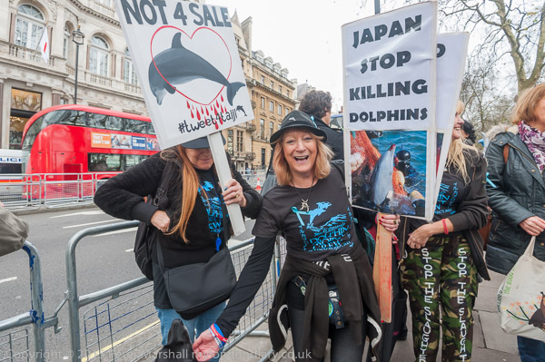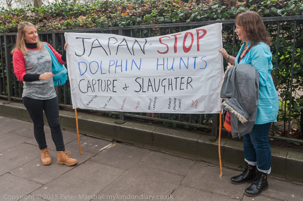 and she holds a placard with a bleeding heart and a dolphin. Behind her the Japanese flag on the embassy cross the road